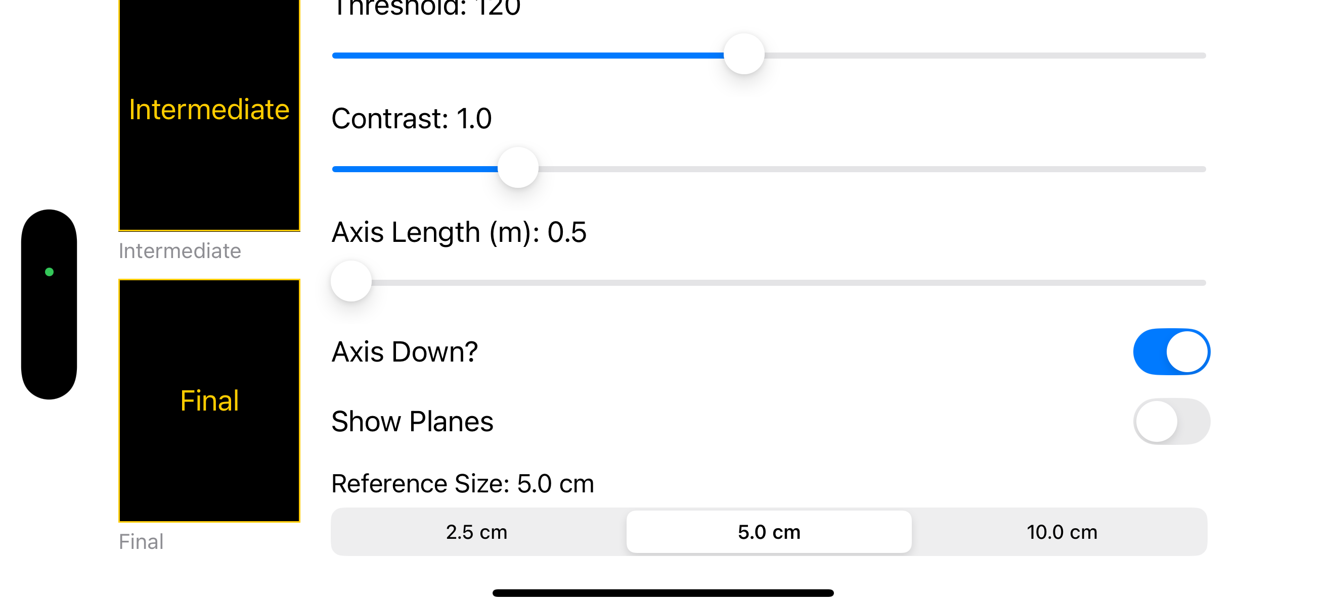 The ‘blue mode’ allows you to insert metric references on the planes of interest. It is indicated by the blue button near the camera icon at the bottom right. “Metric references can be moved and rotated using the apropriate gestures. They can be removed with a long press.”
