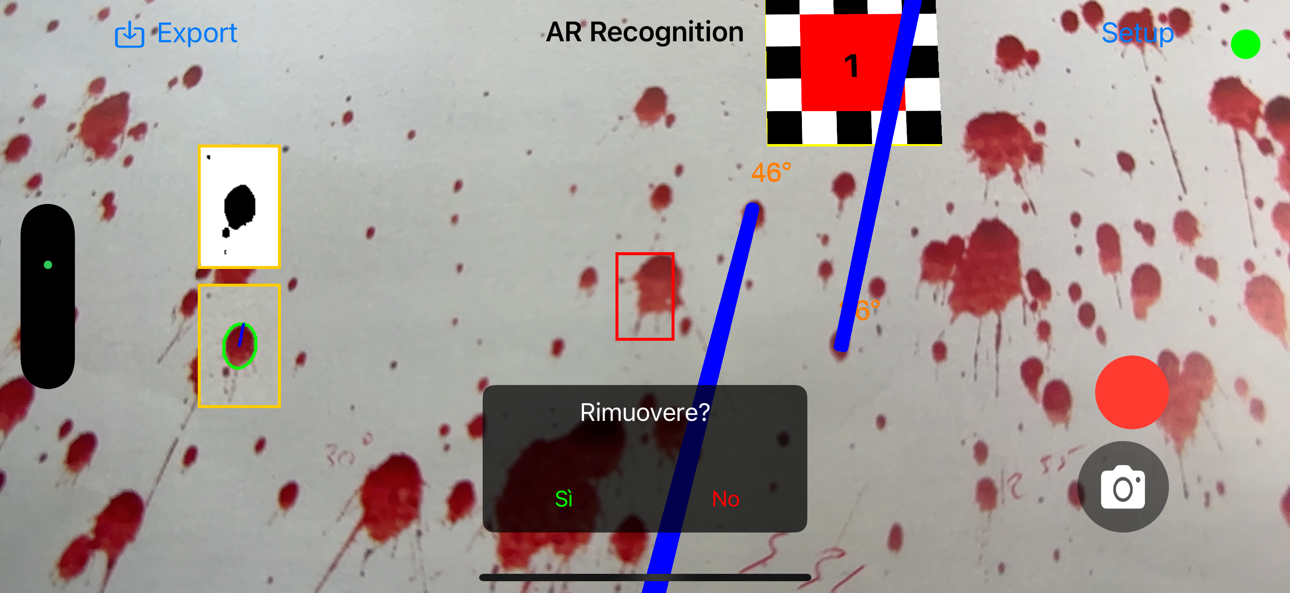 The device must be positioned parallel to the bloodstain and framed within the red rectangle, which turns green when the device’s angle is correctly aligned. By tapping anywhere on the display, the stain recognition process begins. Various filters are applied to approximate the stain to an ellipse, the direction of origin is calculated—assuming it is in front of the operator—and finally, the impact angle is determined.